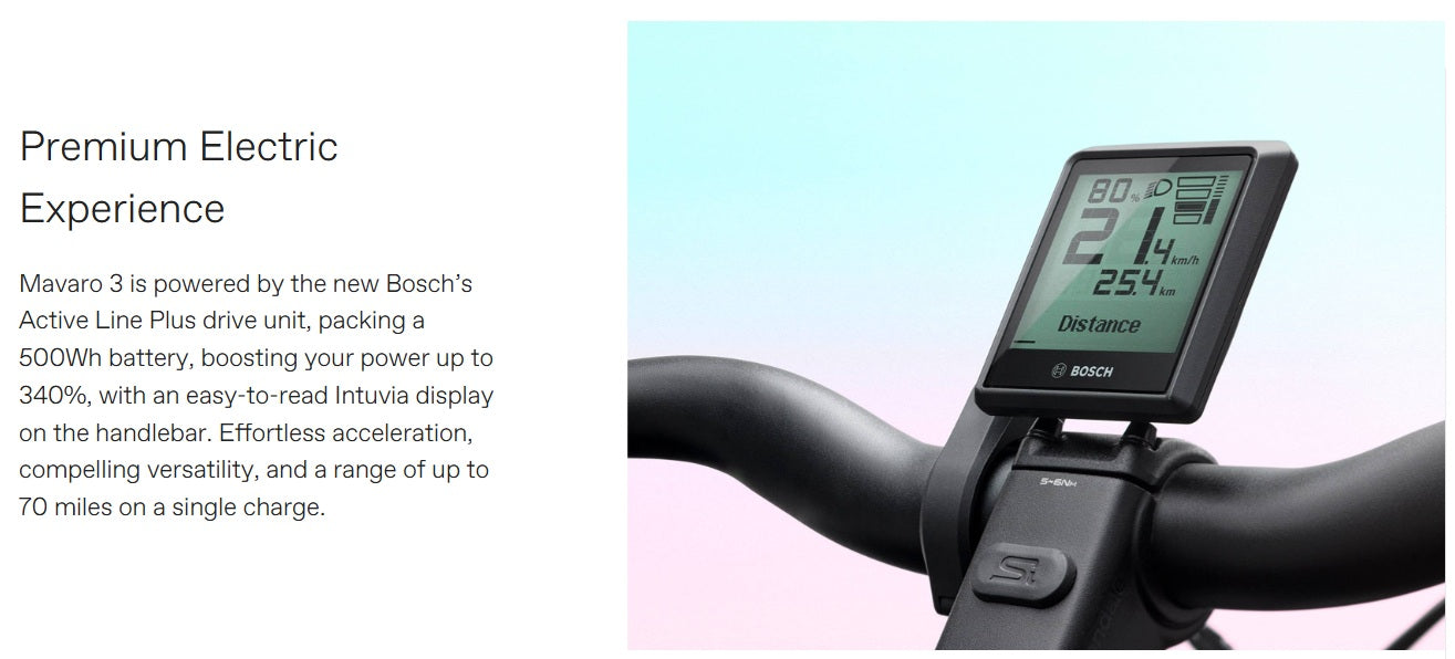 - Premium Electric Experiance - The Cannondale Mavaro 3 is powered by the new Bosch’s Active Line Plus drive unit, packing a 500Wh battery, boosting your power up to 340%, with an easy-to-read Intuvia display on the handlebar. Effortless acceleration, compelling versatility, and a range of up to 70 miles on a single charge.