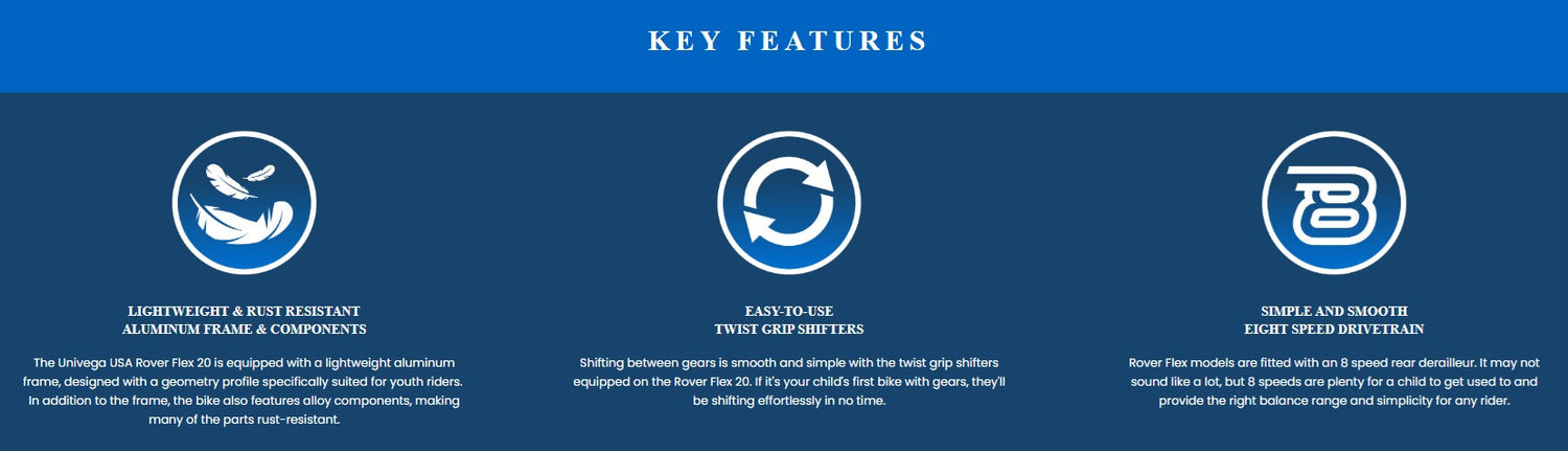 The Univega Rover Flex 20 Inch Kid's Bike is the perfect entry-level all-terrain bike for your child. Lightweight rust-resistant components, versatile semi-knobby / semi-smooth mountain bike tires and easy-to-use twist shifters make this a very capable kids bike. Your child will be the coolest kid on the block!